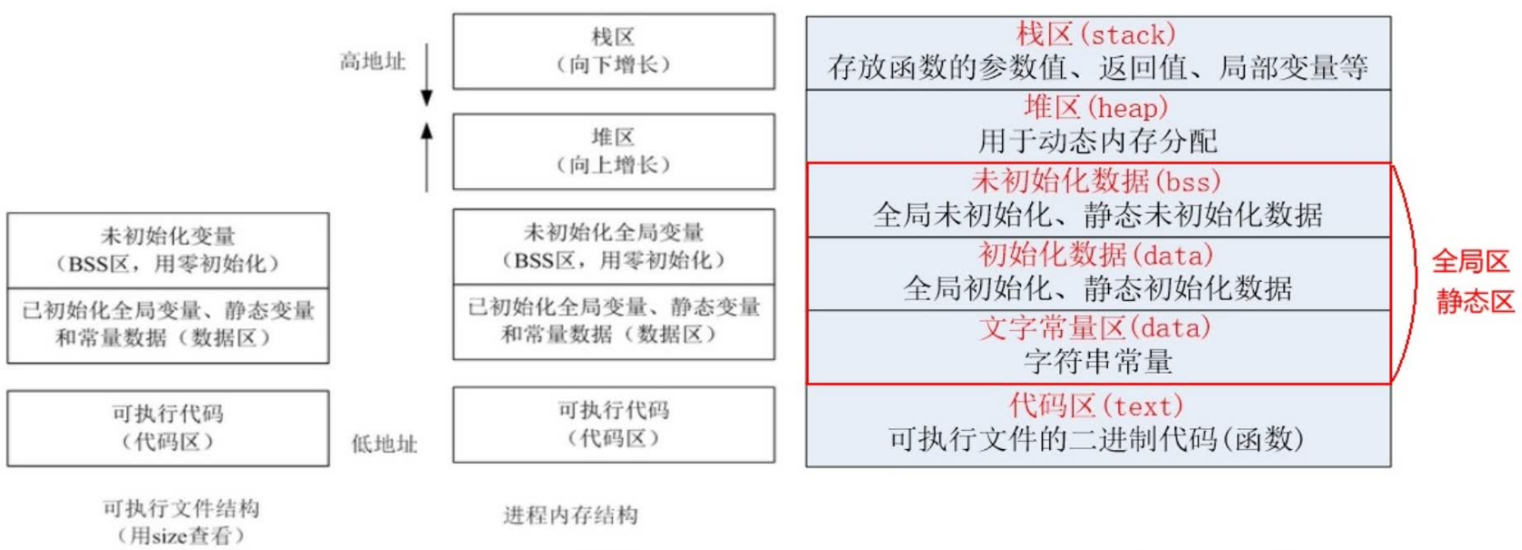 代码区:存放函数体的二进制代码,由操作系统进行管理(cpu执行的机器指令,共享只读)